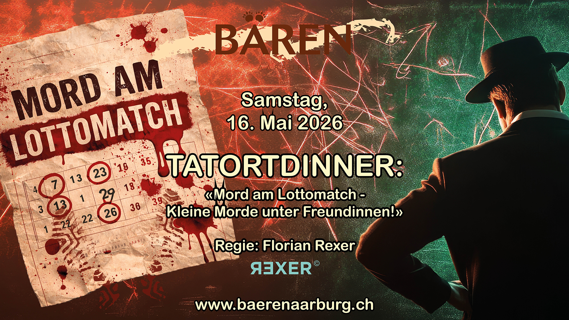 Im Bären Aarburg bieten wir Ihnen spannende Events, die Genuss und Unterhaltung vereinen. Im Bärensaal finden regelmässig fesselnde Krimi-Dinner-Abende statt, bei denen Sie gemeinsam mit Florian Rexer in die Rolle eines Detektivs schlüpfen und spannende Kriminalgeschichten lösen können.